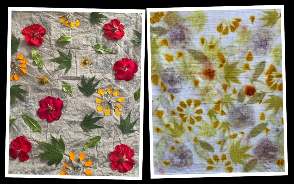 La stampa botanica – o Ecoprinting – è una tecnica di tintura naturale che permette di imprimere sul tessuto le forme e i pigmenti di foglie, fiori e piante intere, trasferiti per contatto tramite pressione e calore.